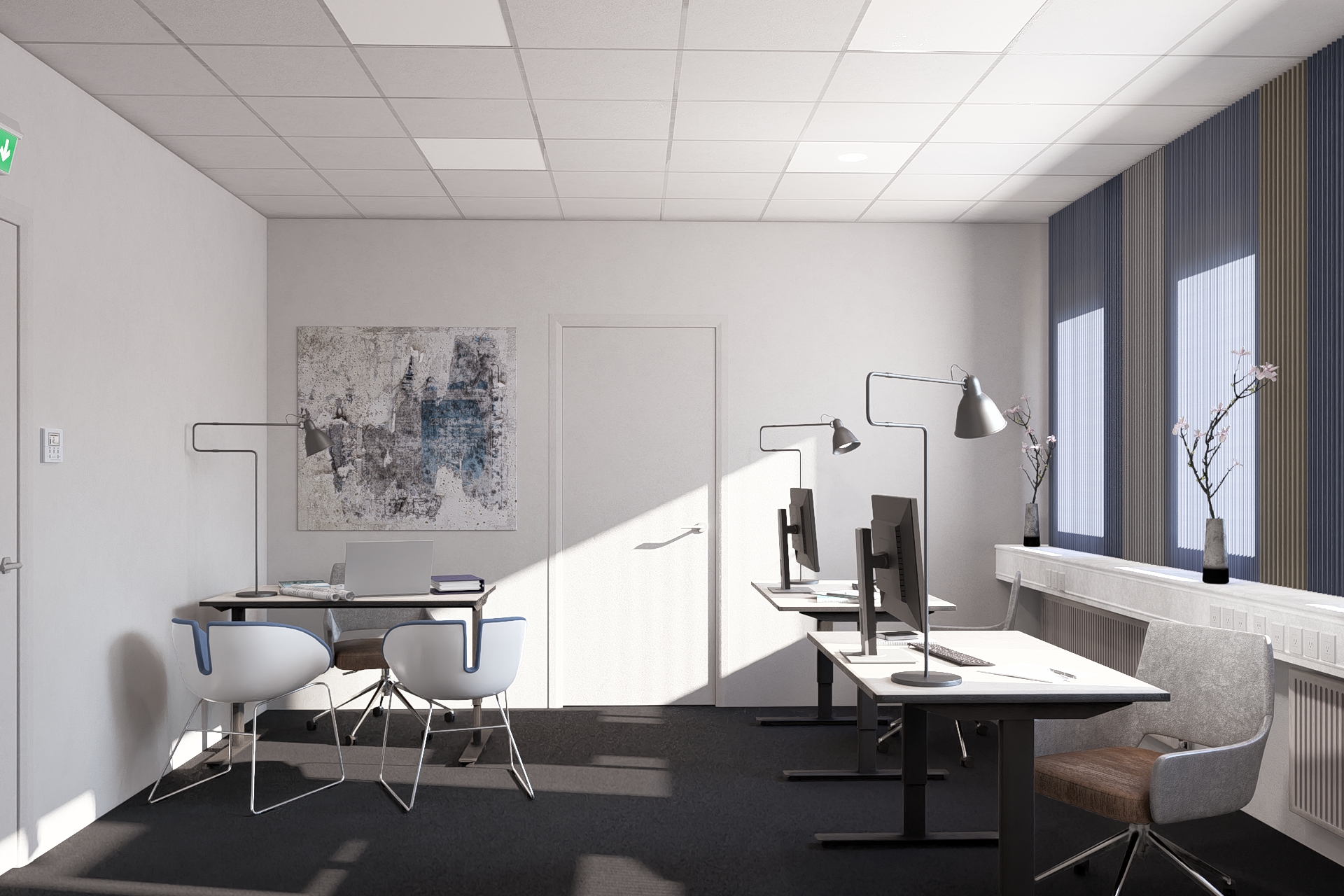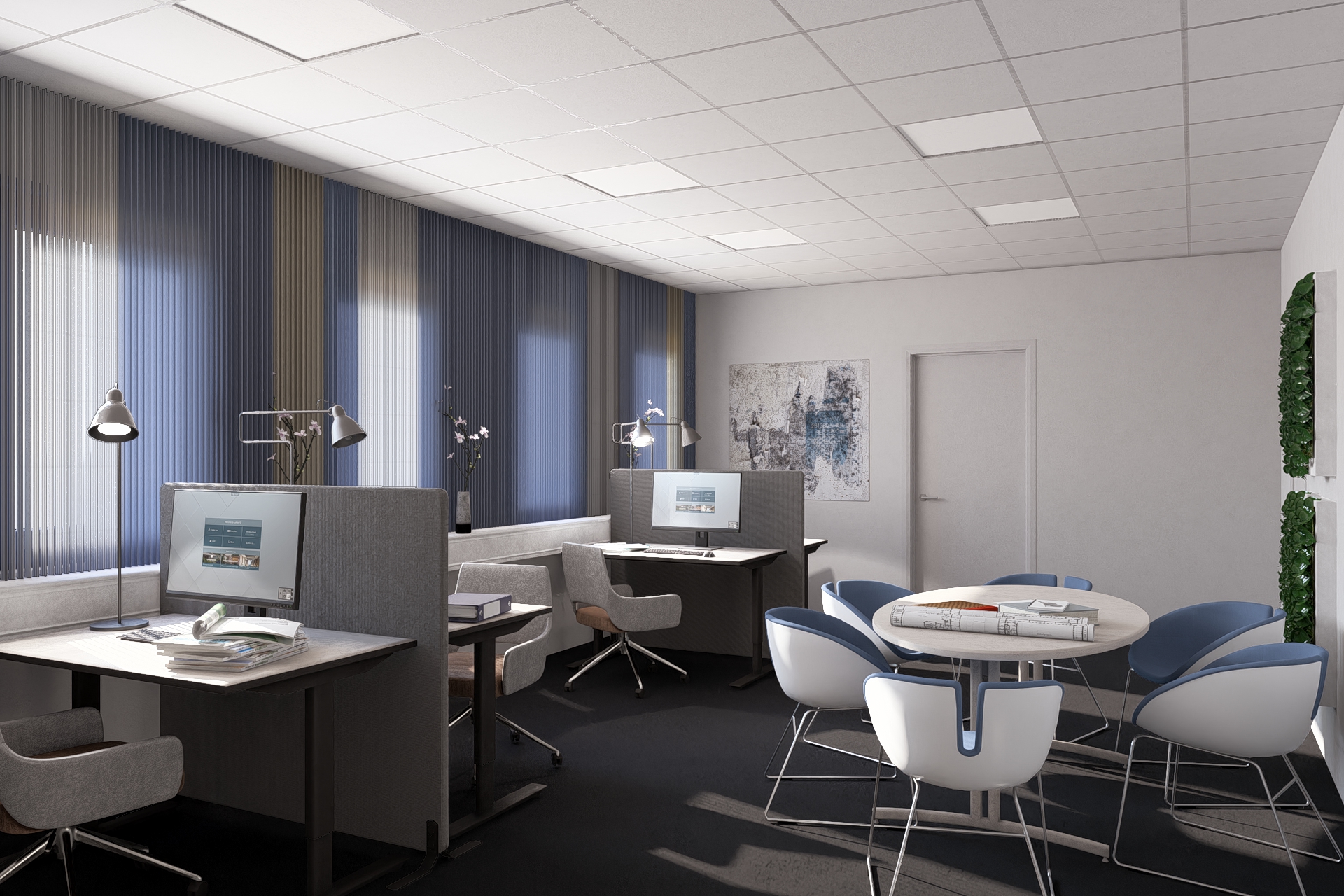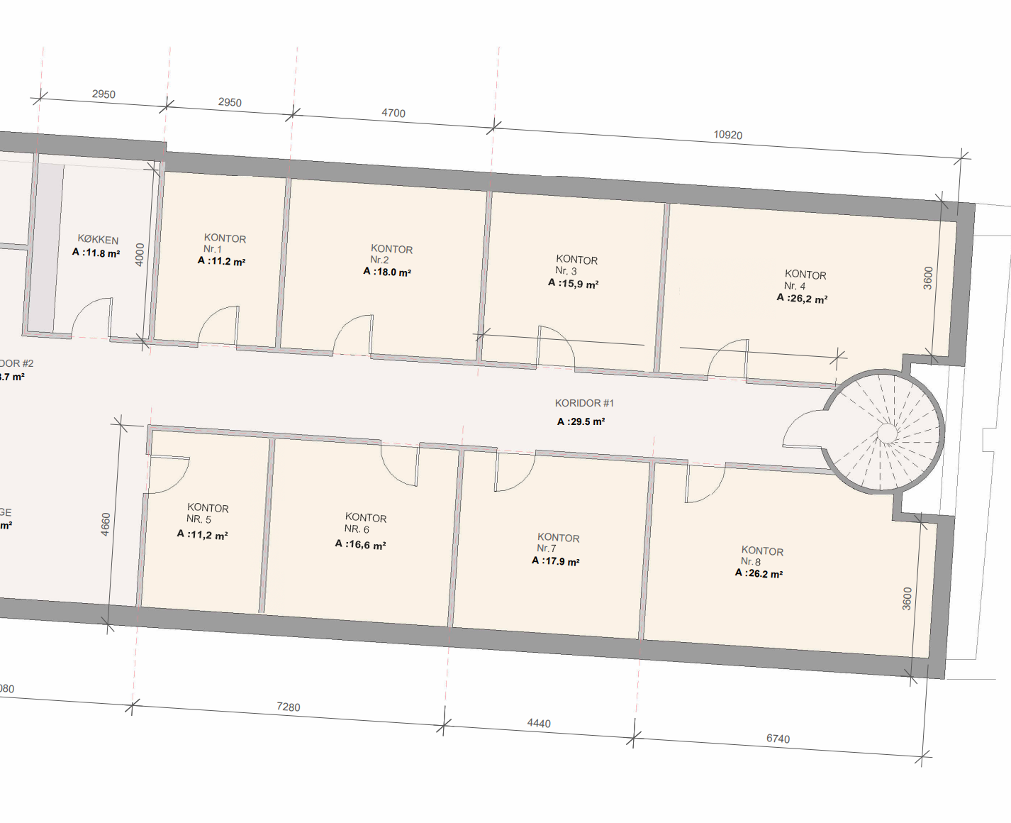 Nedenfor præsenterer OfficeAalborg en detaljeret plantegning, som fungerer som en lejemålsvælger. Her finder du specifik information om hver kontorlejlighed, herunder status, nummer, areal og pris. Derudover er der inkluderet visualiseringsbilleder af hvert kontor, der er skabt ud fra de præcise mål for at give et realistisk indtryk af lokalerne samt inspiration til indretning.
